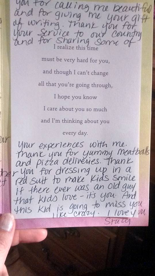 I bought this card weeks ago, months ago maybe. And it's sat here waiting for me to find words to write to somehow express what my heart wants to say to you. And I can't find the words. There aren't any adequate. And I don't even know if you will be able to read this anyhow. All I know is that you have been more to me than a "Thank you" would cover. But, thank you for your songs, your laughter, your jokes, your chocolate. Thank you for always being happy for me when I'm having another baby. Thank you for being at birthdays and stopping in to say hi to me on random days when I needed a smile more than you knew. Thank you for calling me beautiful and for giving me your gift of writing. Thank you for your service to our country and for sharing some of your experiences with me. Thank you for yummy meatballs and pizza deliveries. Thank you for dressing up in a red suit to make kids smile. If there ever was an old guy that kids love - it's you... and this Kid is going to miss you like crazy.